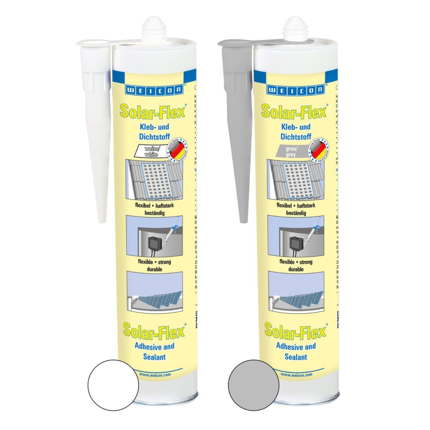 WEICON Solar-Flex is strong, non-corrosive, paintable (wet-on-wet), weather-resistant and resistant to UV rays. It is free of silicone, isocyanate, halogens and solvents. Solar-Flex is an elastic adhesive based on MS polymer specially developed for the solar industry. Both the very high initial bonding power and the fast development of adhesive strength enable bondings even on vertical surfaces. Replaces traditional fixings in the assembly of solar and photovoltaic power systems.