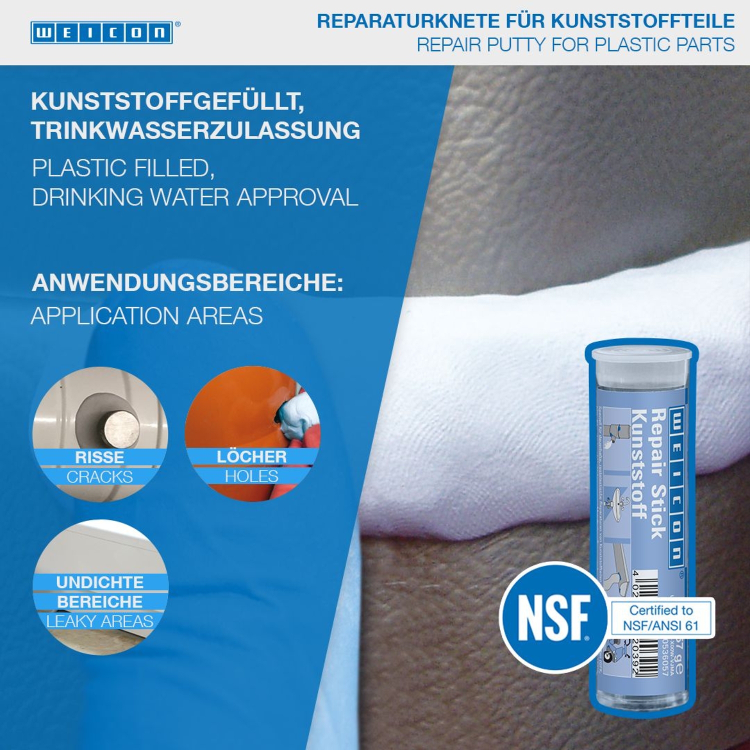 WEICON Repair Stick Plastic was developed specially for the permanent repair of plastic components and composite materials with residual elasticity such as window and door frames, panelling and bumper bars. It is suitable for bonding metal pieces, such as pipes and pipe bends, fittings and flanges, water tanks, pumps and housings. The Repair Stick can be used in tank construction and apparatus engineering, in the food, cosmetics and pharmaceutical industries and in many other applications.