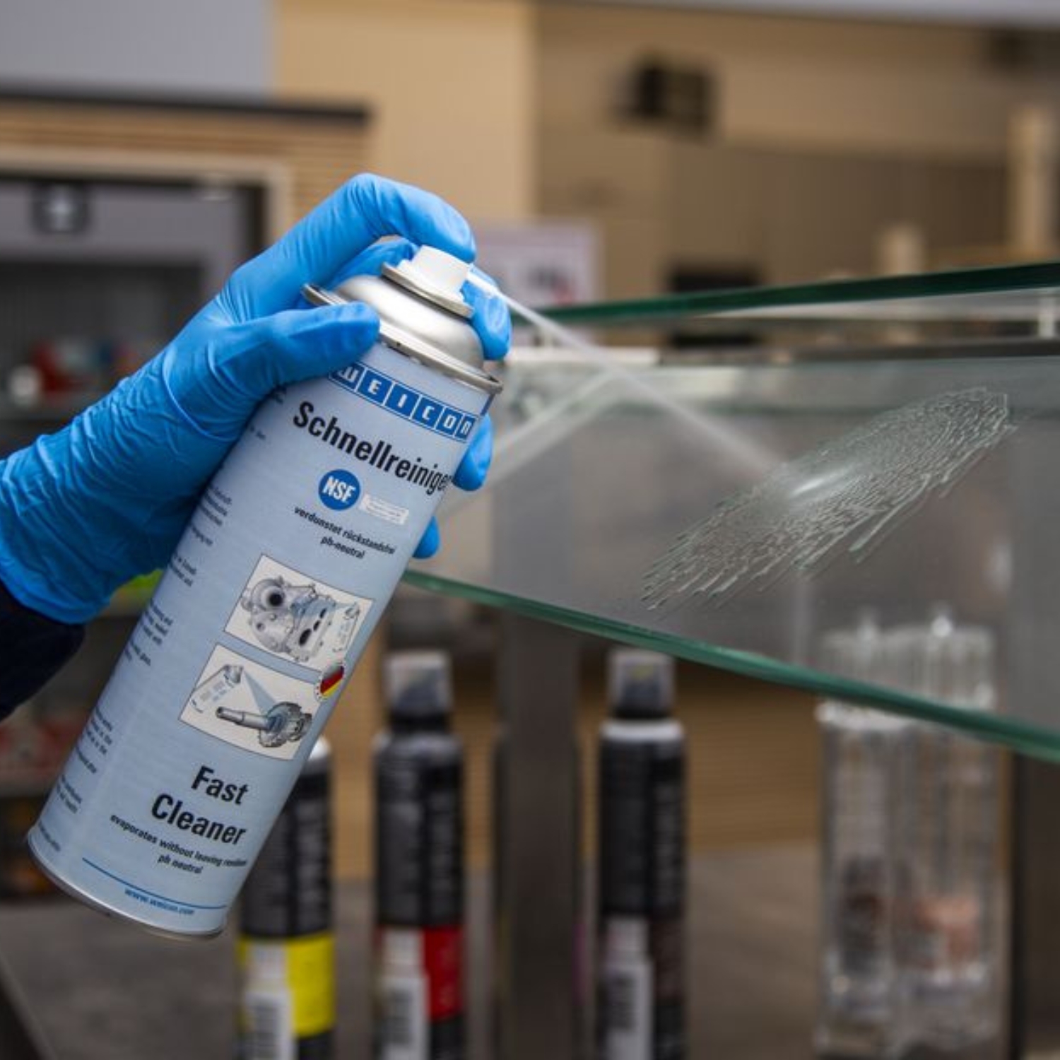 WEICON Fast Cleaner has an NSF registration for the food industry and can therefore be used as a cleaning and degreasing agent for the removal of contamination generated within the scope of maintenance works and for the removal of non-cured adhesive residues in the food industry, in the food and beverage industry and in the pharmaceuticals and chemical industries. Fast Cleaner is used to clean and degrease surfaces which are bonded or sealed with WEICON adhesives and sealants, or which are going to be coated with WEICON Metal Sprays. Fast Cleaner is pH-neutral and material compatible, and can be used on many different materials such as metals, glass, ceramics and most rubbers and plastics. Due to its special formula and the resulting NSF registration, the Fast Cleaner can contribute towards improvements in occupational safety and health protection.