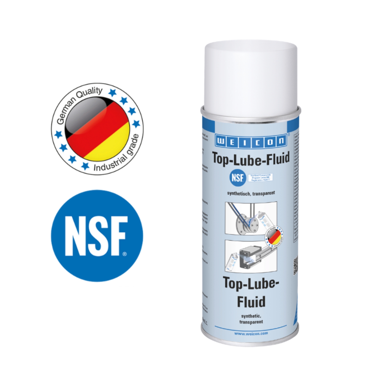 WEICON Top-Lube-Fluid is a special adhesive lubricant and has an NSF registration for the foodstuffs sector, which means it can be used in the food and beverage industry and in the pharmaceuticals and cosmetics industries. Top-Lube-Fluid is strongly adherent and pressure-resistant, with excellent capillary action, and is also noise-damping and water-repellent. The spray prevents elongation, friction and wear. Due to its special formula and the resulting NSF registration, WEICON Top-Lube-Fluid can contribute towards the improvement of workplace safety and health protection. The spray can be used on toothed wheels and worm gears, on joints and couplings, on rollers and bearings, on chains and wire cables or on spring assemblies as well as in numerous industrial areas.