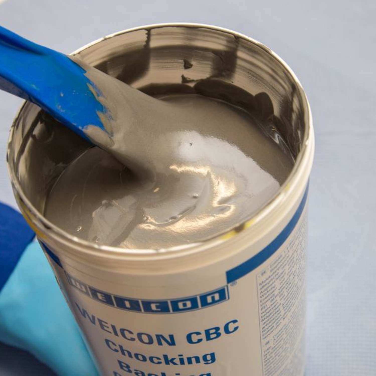 WEICON CBC is suitable for the shimming and backfilling of systems difficult to align in the industrial and maritime sector. The “ABS Product Design Assessment” certified system serves as a replacement for fittings and worn metal sheets and ensures the direct contact to foundation plates. The special epoxy resin system has a low viscosity, is very flowable and self-levelling. It has a pot life of 45 minutes and cures nearly shrink-free. It provides a permanent high-static stability and has a high resistance to ageing. The epoxy resin system adheres particularly well to steel and concrete. It has a good compressive strength and is resistant to oils, fuels and many chemicals. It is vibration-resistant as well as temperature-resistant. Due to almost no cure shrinkage, machines and systems keep their specific alignment after the casting of WEICON CBC.