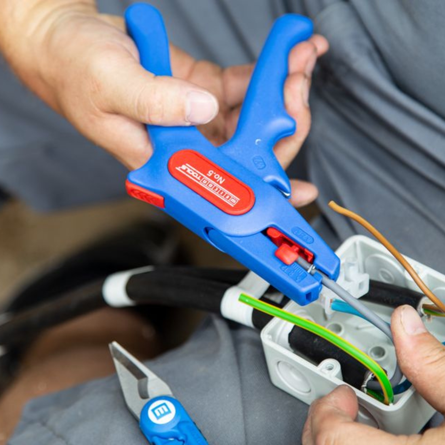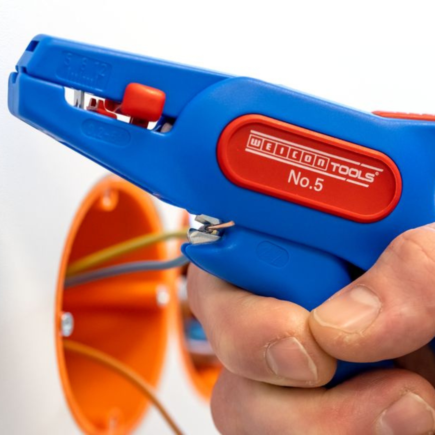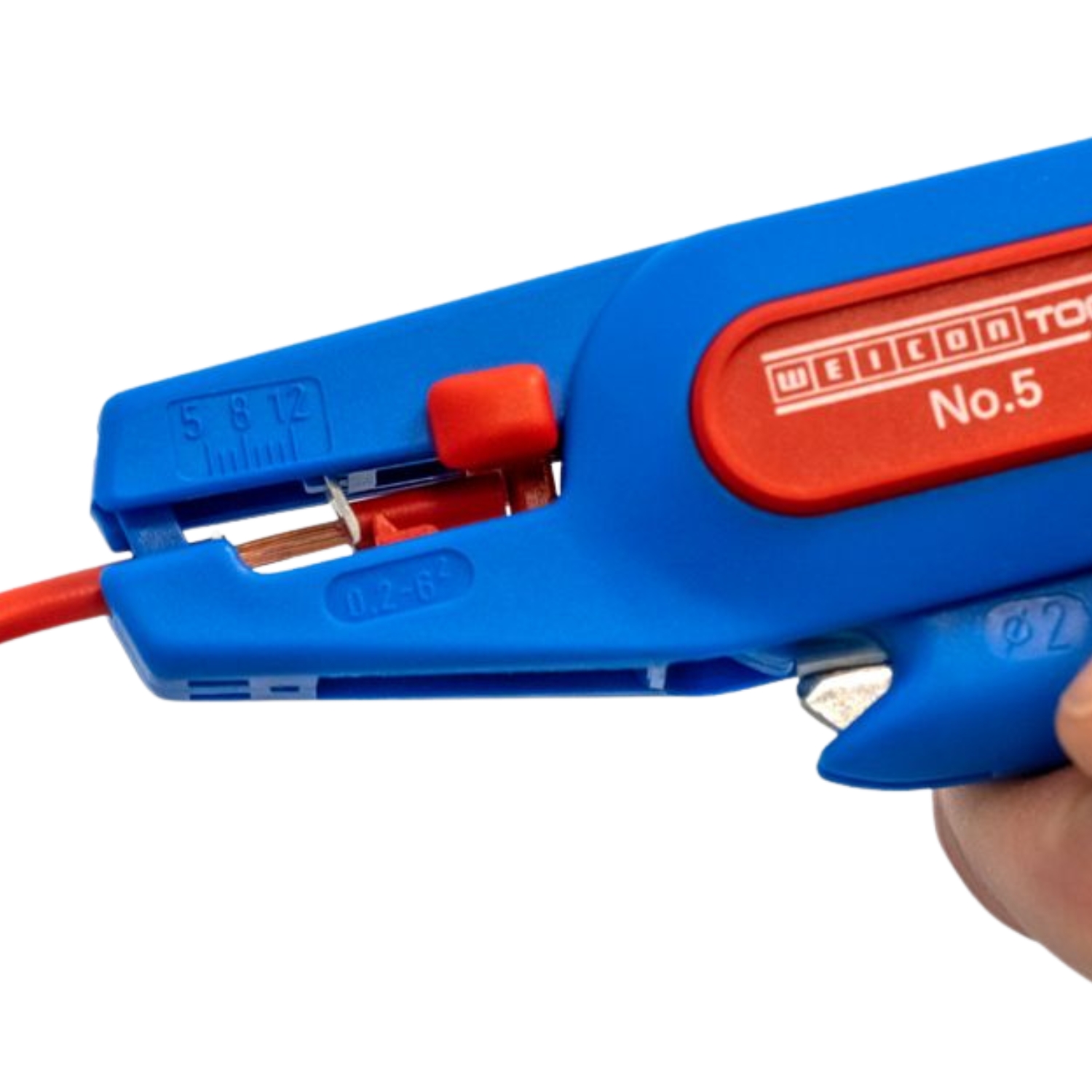 The WEICON Wire Stripper No. 5 is suitable for stripping all stranded and solid conductors from 0.2 – 6.0 mm². The wire stripper also has a visual length scale from 5 – 12mm. The length stop can be removed, if required. A well-accessible side cutter is integrated in the tool, which is suitable for cable diameters up to 2 mm. The blades are replaceable. The low weight of the No. 5 ensures fatigue-free working.