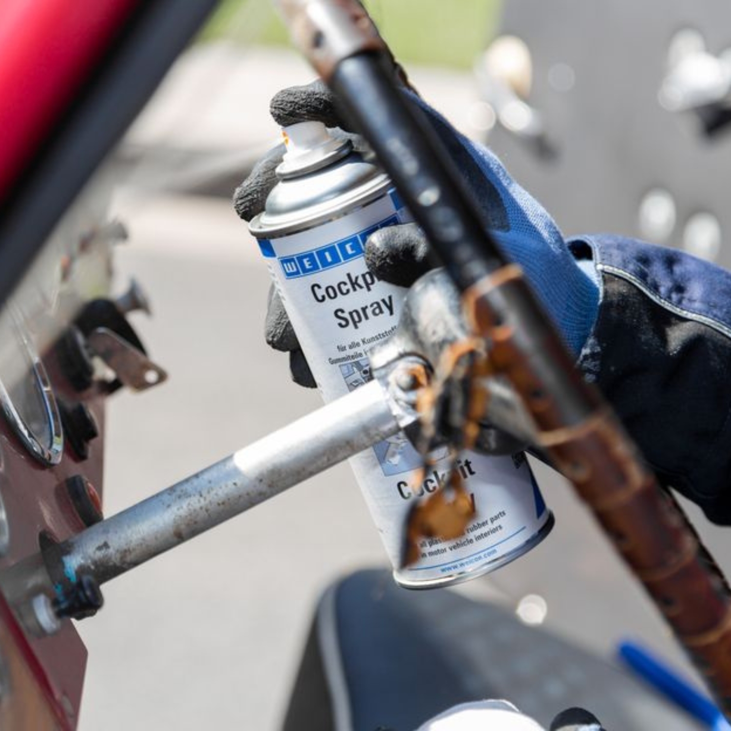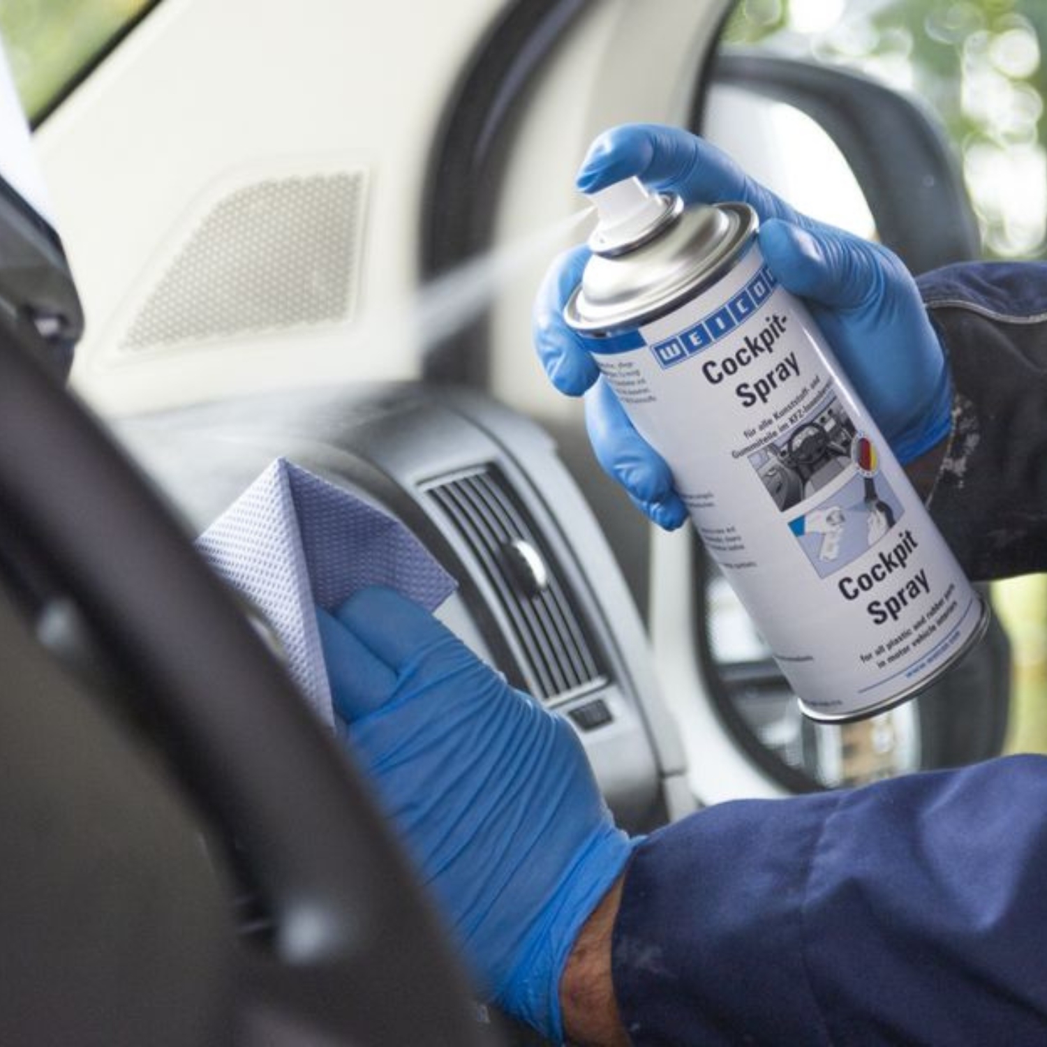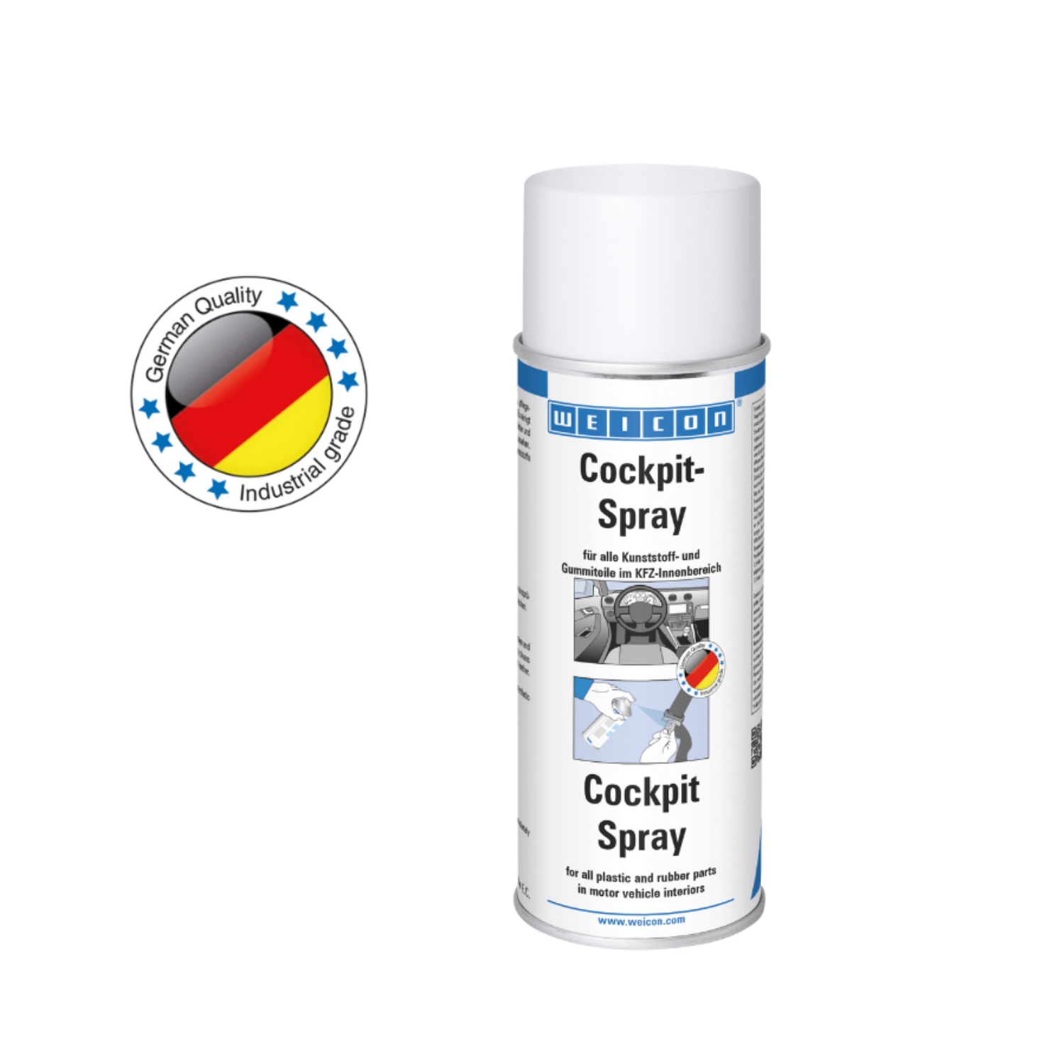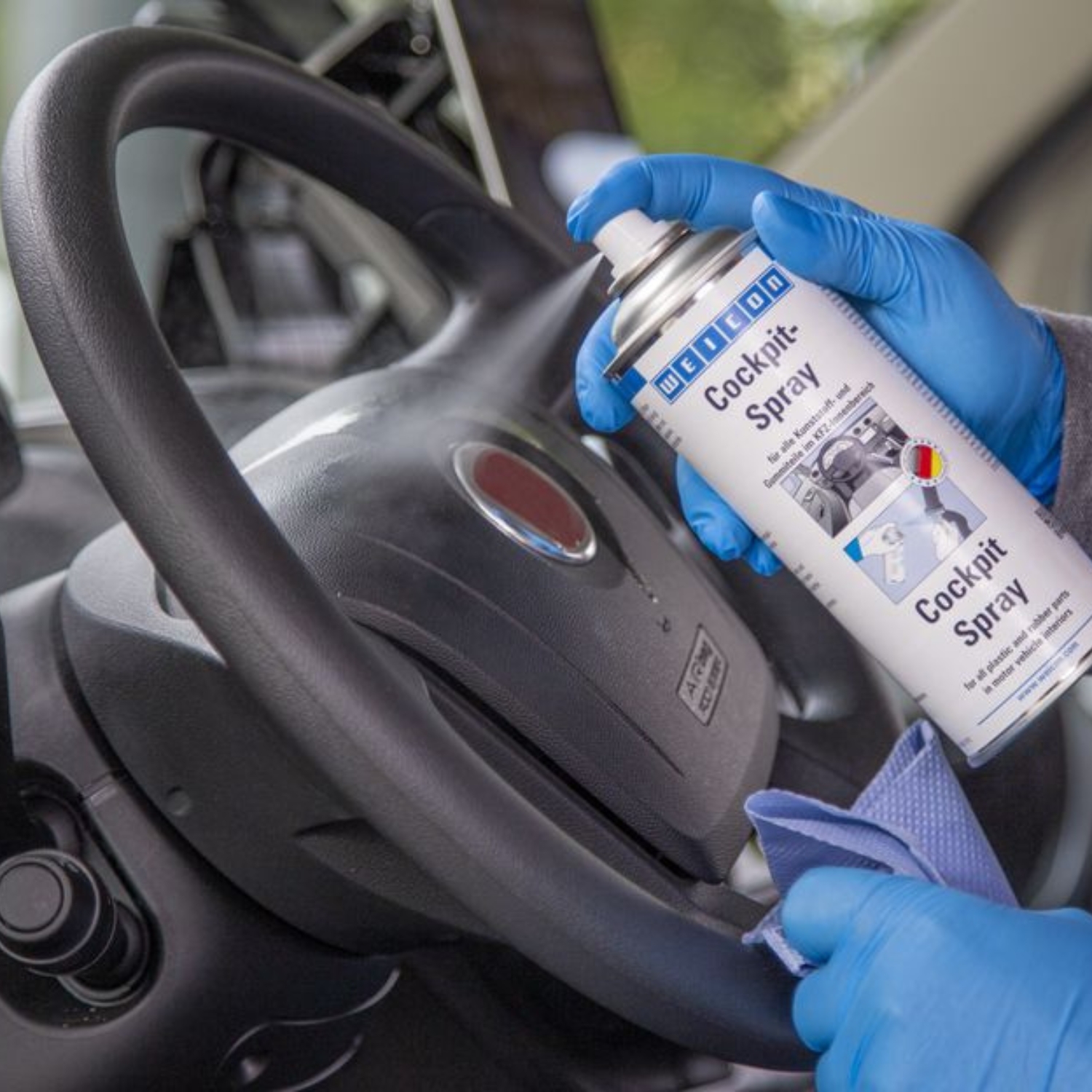 WEICON Cockpit Spray is a water-repellent care product for all plastic and rubber parts as well as for varnished wood surfaces in motor vehicle interiors. The permanent, invisible protective film prevents contaminations and creates an easy-care, dust repelling silky shine. Cockpit-Spray refreshes dull and weathered plastic. Rubber does not crack and remains supple and elastic. WEICON Cockpit-Spray eliminates squeaky and creaky noises and maintains dashboards, inside cladding, all plastic and rubber parts, leather, wood, and chromium, and car roofs covered with synthetic leather. It prevents door, window and boot seals from freezing and is used as a lubricant for seatbelts, seat guides, sunroofs, window guides, door locks and wherever greases would cause soilings.