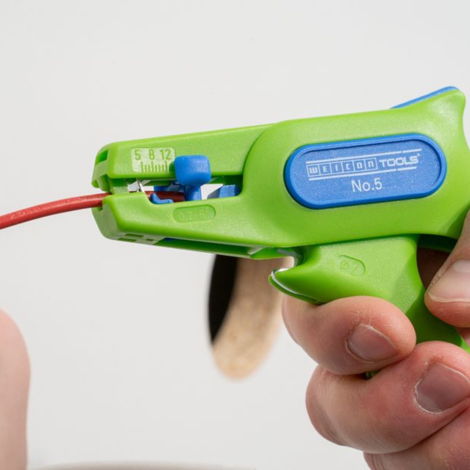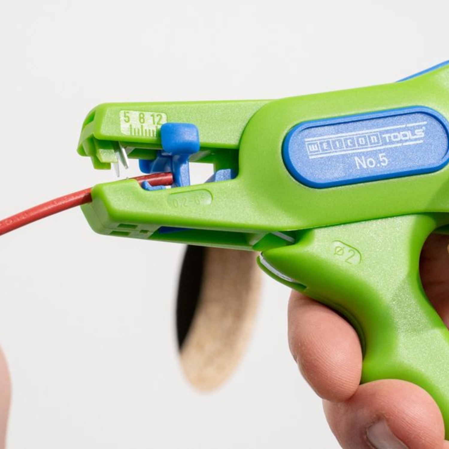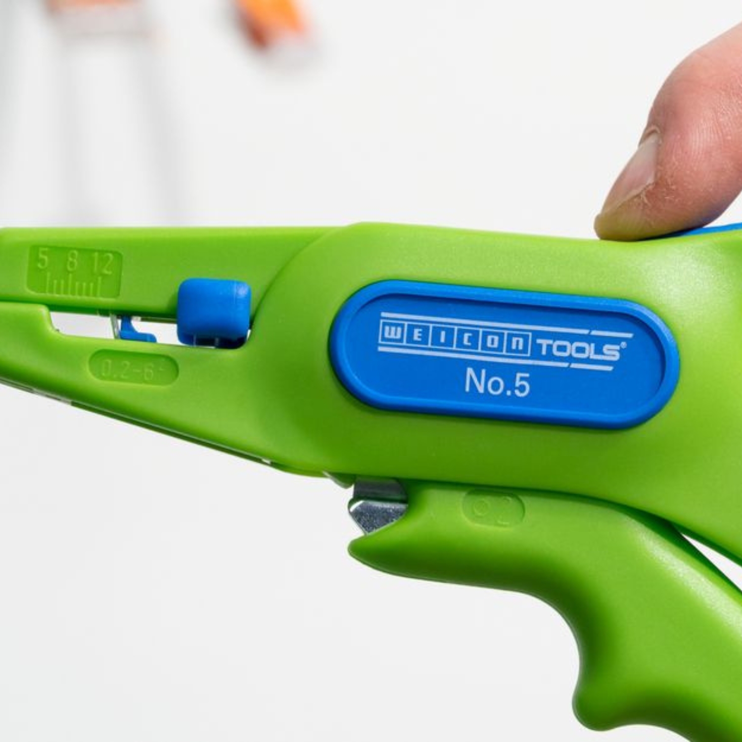 With the Green Line, a very special tool range has been developed. The tools are made of up to 97 % renewable raw materials, which are recyclable and have an excellent life cycle assessment. The WEICON Wire Stripper No. 5 Green Line is suitable for stripping all stranded and solid conductors from 0.2 – 6.0 mm². The wire stripper also has a visual length scale from 5 – 12mm. The length stop can be removed, if required. A well-accessible side cutter is integrated in the tool, which is suitable for cable diameters up to 2 mm. The blades are replaceable. The low weight of the No. 5 ensures fatigue-free working.