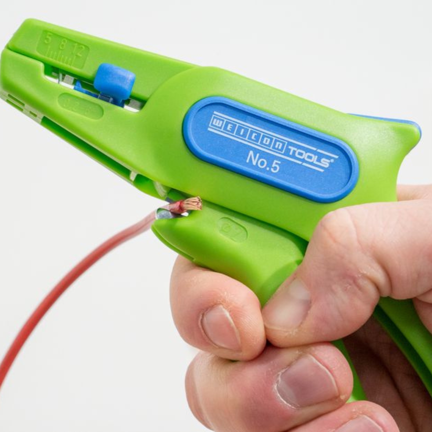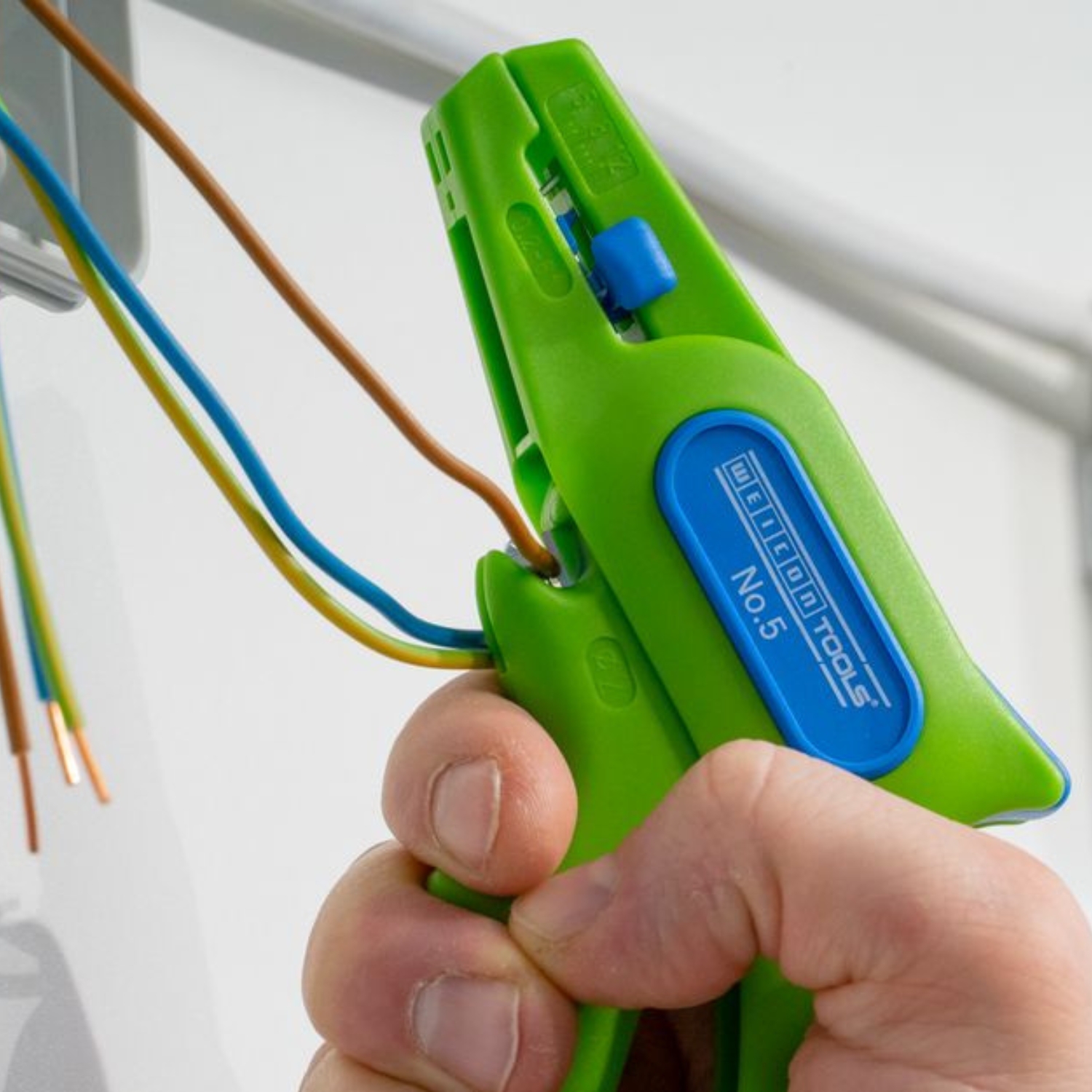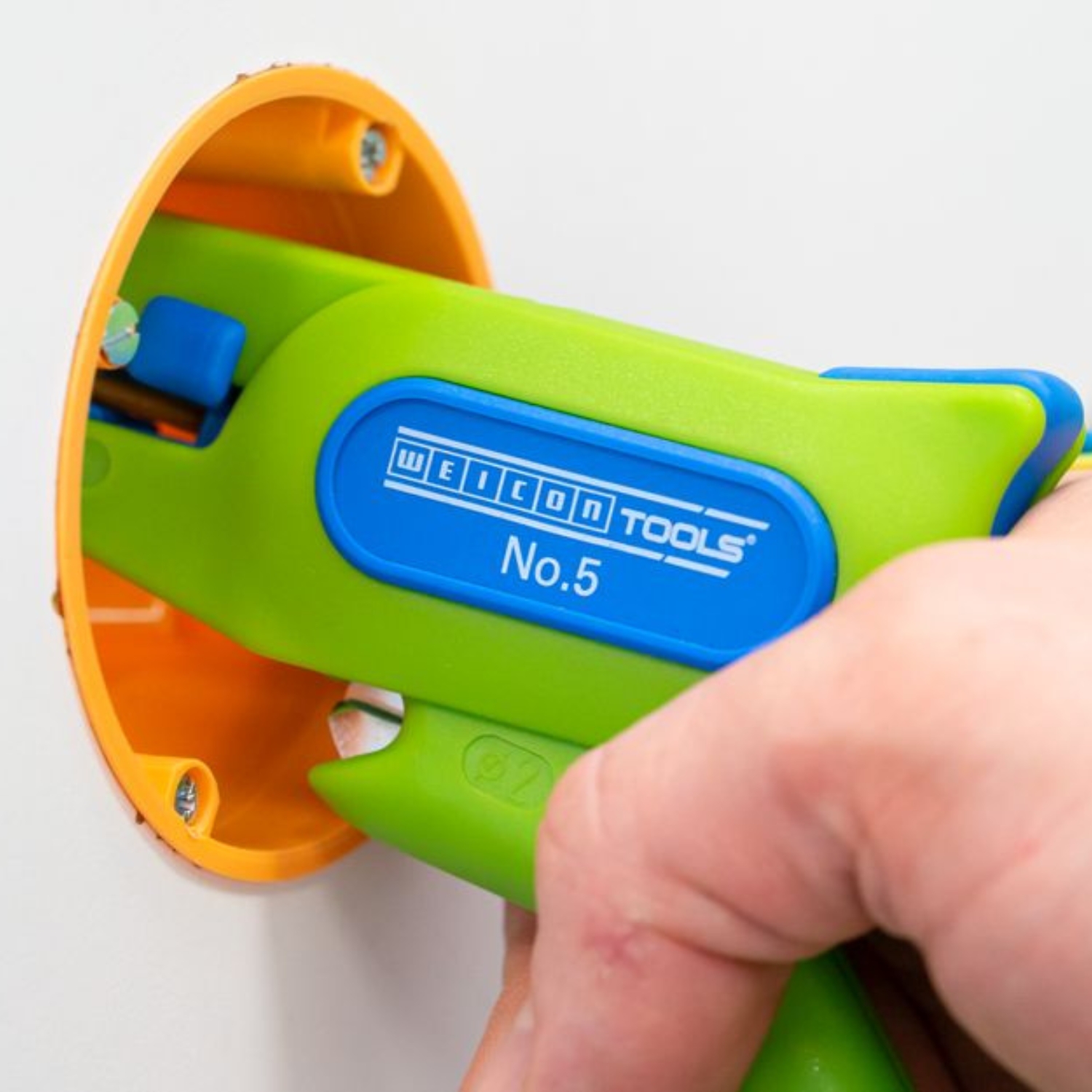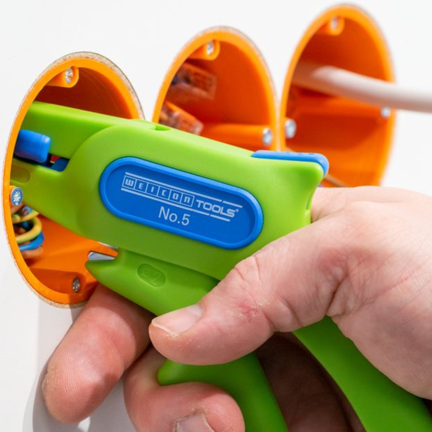 With the Green Line, a very special tool range has been developed. The tools are made of up to 97 % renewable raw materials, which are recyclable and have an excellent life cycle assessment. The WEICON Wire Stripper No. 5 Green Line is suitable for stripping all stranded and solid conductors from 0.2 – 6.0 mm². The wire stripper also has a visual length scale from 5 – 12mm. The length stop can be removed, if required. A well-accessible side cutter is integrated in the tool, which is suitable for cable diameters up to 2 mm. The blades are replaceable. The low weight of the No. 5 ensures fatigue-free working.